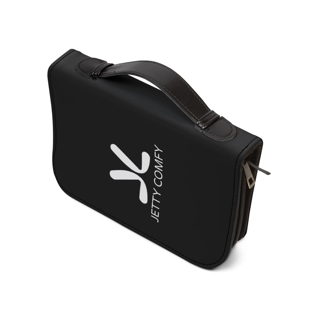This matte black case is made from premium PU leather and features the iconic Jetty Comfy™ logo in bold white. A full zip-around closure and sturdy carrying handle make it perfect for travel, while inner pockets provide organized storage for pens, notes, and bookmarks. Whether it’s your Bible or your journal, it travels safe in Jetty style.